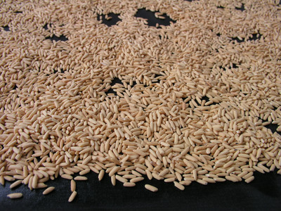 Spread the rice out on a oven tray covered with baking paper and bake for 40 minutes at 180° C. Grind the beans in a coffee grinder.