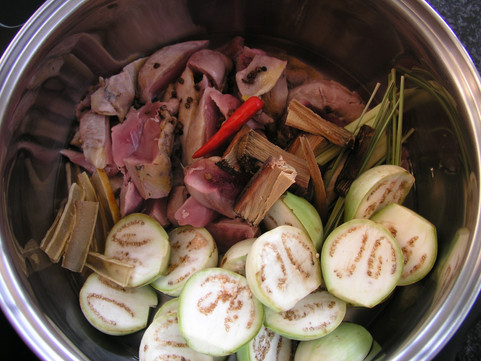 In a large pan, boil 400 ml of water with the bird pieces, lemongrass, Thai eggplants, chilies, buffalo rind, Sichuan pepper, xa khan and fish sauce. Add the unfiltered fish sauce after boiling.