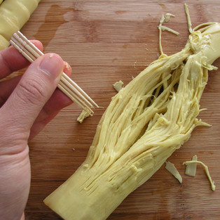 Line up three or four toothpicks in your fingers to form a comb and taper the bamboo shoots, leaving the ends intact. Cook the bamboo for 20 minutes in boiling water to remove the bitterness. Drain and set aside.