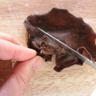 Soak the black mushrooms in cold water for 30 minutes to rehydrate them. Cut them into thin strips and cook them in a small pot of boiling water for 10 minutes.